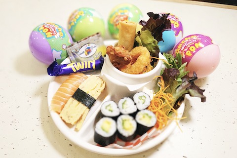 レイン・コーヴ店のみのメニューもあり、1つ目はお子様ランチのキッズ・プレイト($9.80)。サーモンと卵の握り寿司、アヴォカドとキュウリの細巻き、春巻き、唐揚げ、イカリング、チョコレート、そしてオマケのガチャガチャ1個付きの充実度で$9.80というのは十分お得だが、なんと月曜のみ20食限定で、大人が自分の分の食事をオーダーしたらキッズ・プレイトが無料になるという驚きかつ嬉しいキャンペーンを実施中。