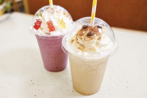 ミックスベリー(左)とコーヒー・フレイヴァーのミルク・シェイク(各$10)