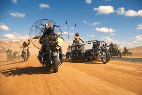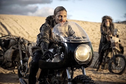興味深いのは、前作では白塗り軍団ウォー・ボーイズの主要キャラのひとりスリット役だったジョシュ・ヘルマン(「アニマル・キングダム」)が、本作では醜悪な特殊メイクによりイモータン・ジョーのもうひとりの息子スクロータスという全く異なる役で再登場。さらにはイモータン・ジョー役のラッキー・ヒュームは本作でもう一役、ディメンタスに仕える片目のリズデイル・ペル役にも扮している。一人二役はヒュームだけでなく、実生活でのクリス・ヘムズワースの妻であるエルサ・パタキーが、冒頭でさらわれるフュリオサをフュリオサの母とともに馬で追う鉄馬の女たち(The Vuvalini)のひとりと、こちらもディメンタスに仕える女戦士ミスター・ノートン役、前者は善玉、後者は残忍な悪玉で登場。ヒュームもパタキーもそれぞれ印象に残るキャラでありながら言われなければ同じ俳優が演じたとは誰にも分からない二役を演じ分けており大成功。リアリティが何よりも求められる映画において、双子役や、別人だが顔が瓜二つの2人のキャラクターを除き、同一俳優が見た目も全く異なるキャラクターで1本の映画の中に出てくるのはかなり珍しいが、ルカ・グァダニーノ監督のリメイク版「サスペリア」(2018)ではティルダ・スウィントンが二役どころか一人三役で出演しているから(しかも3人とも準主役級の非常に重要なキャラクター!)、最近の映画界の流行りの一種でもあるのだろうか。