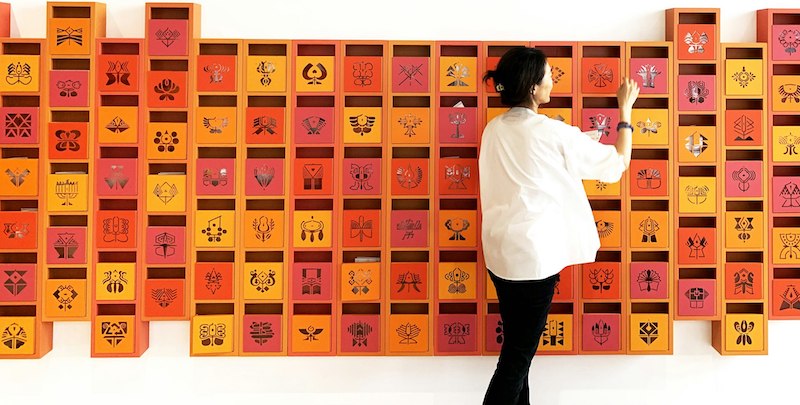 香港を拠点に活動する日本人アーティストであり建築家でもある伊藤彦子(ひここ)さんが制作したインスタレイションを展示した同展は、アパートやマンションの郵便受けをイメージしたような形状のもので壁沿いに連なった一個一個の箱の扉にすべて絵柄の異なる透かし彫りの絵があしらわれ、箱の数366、つまり、うるう年の1年間の日数と同じである。