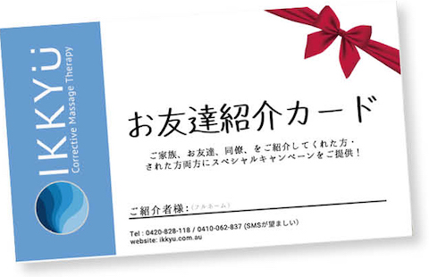 ●Suite 10, 6-8 Pacfic Hwy., St Leonards ℡: 0420-828-118 / 0410-062-837 (SMSが望ましい) ■月・水・木10am-9pm、金10am-6:30pm、土9:30am-4pm、火・日9:30am-1:30pm 不定休(通常開院時間外でも必要に応じて柔軟に対応) Email: ikkyumassage@gmail.com インスタグラム:ikkyu_massage 公式サイト:ikkyu.com.au