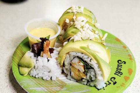 どれにしようか迷うほど種類豊富な巻き物から、まずタイガー・プラウン・ロール($6)は綺麗にスライスされたアヴォカドで巻いてあり、中には海老の天ぷらが入っている。カレー風味のソースをかけて頬張ると、上に載った天かすのザクザク食感がアクセントに。