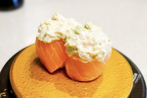 サーモン&アヴォカド・シーフード・シップ($7)は、酢飯を海苔ではなく贅沢にサーモンで巻いた軍艦で、上には一見、卵サンドで使うゆで卵のように見えるがそうではなく、細かくカットしたイカにアヴォカド、サーモンを和えたものが載り、口の中で全体が一体化して溶けていく。