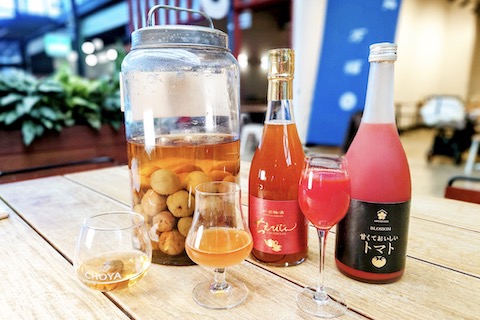 左から自家製梅酒($12)、紅茶梅酒「ちえびじん」($10)、完熟トマト酒「甘くておいしいトマト」(60ml $10、ボトル$110)