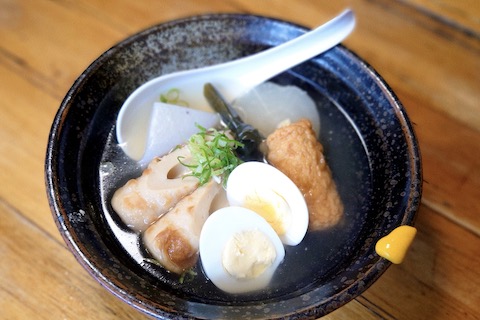 9月に入ったとはいえ日によってはまだ寒い日が続くシドニーにあって、おでん($12)がオーダーできるのも大変貴重。家では大量に作り残ってしまいがちなので1~2人前の量がちょうどいい。具は卵、ゴボ天、チクワ、コンニャク、大根、昆布という王道が入っており、どれも味が染みていて美味。優しいダシが冷えた身体に染みわたる。