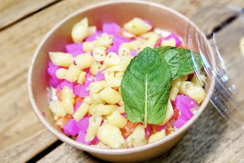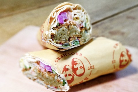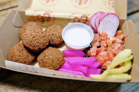 メニューは揚げ立てのファラフェル3個を串に刺した、ヘルシーなおやつとてもおすすめのファラフェル・スキュワー($5/タヒニ・ソース付き)、大判のレバニーズ・ブレッドで巻いたお馴染みのファラフェル・ラップ($13)、ファラフェルとピクルスなどの野菜を盛り合わせた見た目も華やかなランチ・ボックスのファラフェル・プレイト($13)、そしてファラフェル・サラダ($13)の4種類。