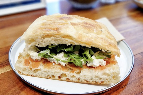 フォカッチャにサバ味噌を挟んだサバ・サンドウィッチ(ハーフ$12.80、フル$18.80)はパンとサバ味噌という一見合わなそうな組み合わせだが、一口かじると厚みのあるサバと味噌の香ばしい塩気がフォカッチャとベストマッチで驚き。スイス・チーズとローストしたカプシカム、バジル・ペストも入った謙さんお得意のジャパニーズ・イタリアンな美味しさ。