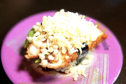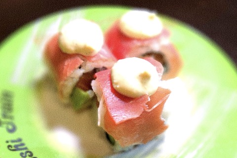 プロシュット・ロール($6)もどの店舗でも取り扱っているわけではないそうで、さわやかなバジル・マヨとアヴォカドがほどよい塩気のプロシュットとよく合うイタリアンな寿司ロールだ。
