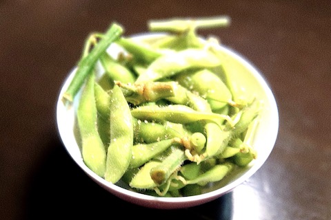 ビールのお供にぴったりな枝付きの枝豆($4.50)