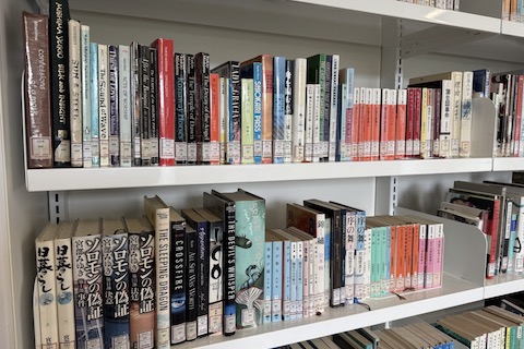 小説の棚より。同一著者の日本語原書と英訳本が並んでいるので読み比べてみては?
