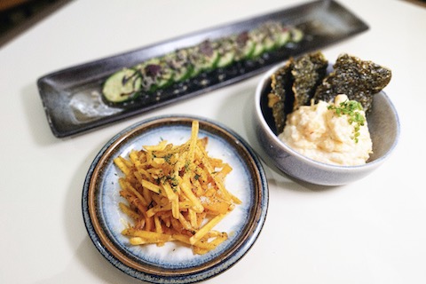 奥から時計回りに一本キュウリ($9)、エビス・ポテト・サラダ($13)、ニンジンムーチョ($9)