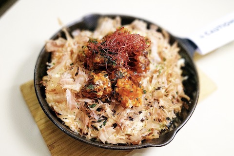 新メニューのハバネロ・チキンお好み焼き($30)はお好み焼きの上に特製ハバネロ・ソースを絡めた唐揚げが載せられ、お好み焼きの上にもハバネロ・ソースがかかっており、食べ進めるうちにピリ辛感が増すが試行錯誤を繰り返したメニューとあってちょうどいい辛さ。