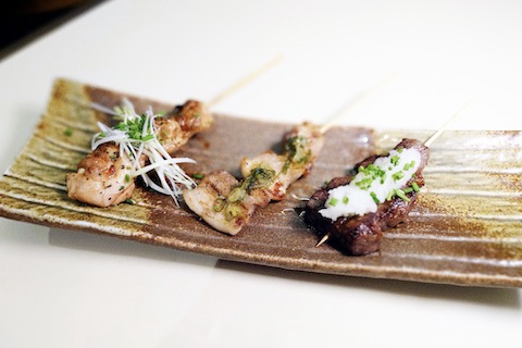 串焼き各種、左から鶏モモ($6.80)、豚バラ($7.80)、和牛($9.80)