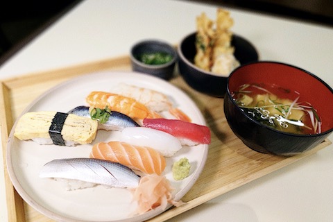 平日のランチ・スペシャルは曜日により海鮮丼(月曜)、ウナ丼(火曜)といった具合に一律$25で提供しており、取材では金曜の握り寿司セット(通常は$30が金曜ランチのみ$25)を用意してくれ、こちらにもアジやコハダが入っており、かき揚げと揚げ出し豆腐に小鉢、味噌汁付き。