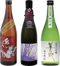 左から飛騨自慢 鬼ころし 純米原酒 怒髪衝天(720ml: $39.95)、風の森 愛山807(720ml: $48.95)、半蔵 純米大吟醸 神の穂(720ml: $58.95)