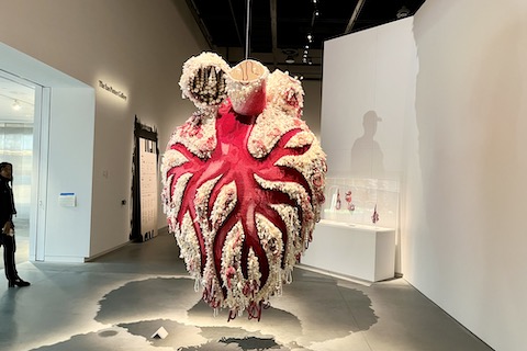 今回の参加アーティストの中には新潟県出身の在日韓国系3世で、多摩美大卒後、愛知県立芸術大学で修士課程を修め(どちらも版画専攻)、2010年以降はオーストラリア人の夫とともにメルボルンを拠点に創作活動を行っている辛愛麻(しん・えま)さんも含まれる。愛麻さんは人間の心臓を、さまざまな繊維素材を用いタピストリーの製法で織り込んだものをさらに立体的に造形化した「不在な女たちの心(Hearts of Absent Women)」というタイトルのシリーズ作品で知られる。彼女の祖父が保管していたという辛家の一族の族譜(※日本でいう家系図)にインスパイアされたといい、そこには実に32代昔までさかのぼって一族の男性全員の名が記されている一方、女性の場合は男児を出産した者のみで、女児、そして女児しか産まなかった女性の名前は一切記載されておらず、あたかも存在しなかったかのように忘れ去られた一族の女性たちへの敬意を表しての辛愛麻さんの作品は、今回のビエンナーレのテーマ「リメモリー」にもふさわしい。ビエンナーレでは愛麻さんの作品としては最大級の高さ2メートルの大型作品を筆頭に小作品数点がチャウ・チャク・ウィン博物館に展示中。